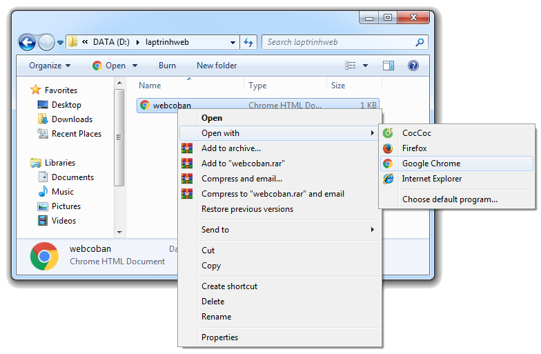 - Thực ra thì cách chạy một tập tin HTML khá là đơn giản, chúng ta có thể di chuyển thẳng đến thư mục chứa tập tin, sau đó nhấp chuột phải vào nó rồi chọn một trình duyệt để mở.