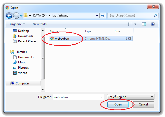 - Sau đó, chọn tập tin HTML mà mình muốn mở rồi bấm "Open"